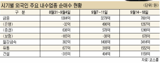 그러다 코스피지수가 1600선 초반에서 중반까지 상승했던 9월 둘째주(7∼11일) 사이 외국인은 은행주를 대거 사들이며 순매수로 방향을 틀었다. 이와 함께 전주 순매도를 했던 건설업 역시 이 기간에는 순매수로 돌아섰다.