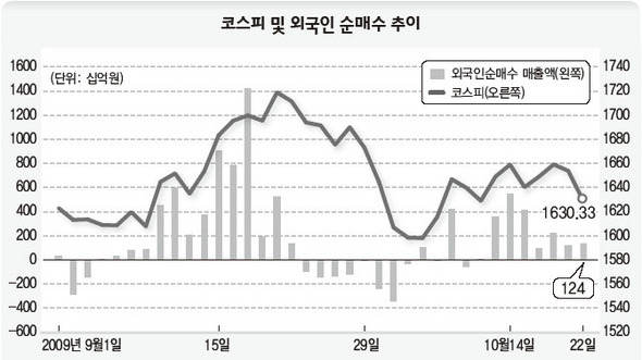 22일 유가증권시장에서 코스피는 전날보다 23.53(1.42%) 떨어진 1630.33으로 마감했다. 코스피는 지난 9월22일 1718.88까지 솟구친 뒤 10월초에는 1598까지 내려앉았고, 이후 어렵사리 회복세로 돌아서긴 했지만 1620~1660 사이에 갇혀 좀체 벗어날 기미를 보이지 않고 있다.