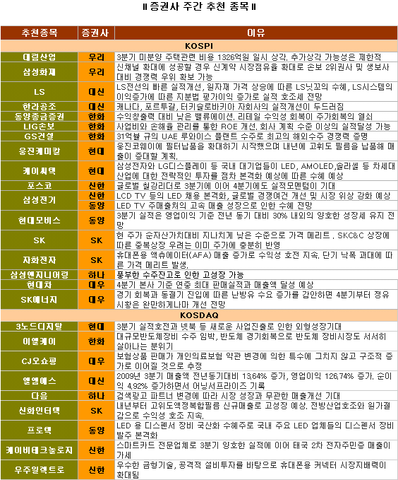 포스코(005490)와 SK에너지 등의 대형주도 주목받았다. 상승장에서는 소외됐지만, 경기회복의 영향으로 4분기 이후부터는 긍정적인 주가 흐름이 예상되기 때문이다.