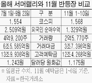 = 10일 한국거래소에 따르면 지난 7월 1일~9월 23일까지 이어졌던 서머랠리와 11월 이후 시장은 수치상 명백한 차이를 보인다. 여름 상승장의 일 평균 거래량은 4억9200주, 거래대금은 6조5585억원으로 모두 최근 장보다 두 배 수준이었다. 무엇보다 당시엔 외국인이 하루 평균 2509억원을 순매수했지만 최근 열흘간은 1329억원으로 크게 줄었다.