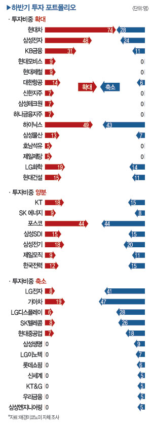 설문에 응답한 펀드매니저 305명의 하반기 포트폴리오는 베스트 애널리스트 34인의 추천종목과 대동소이했다. 투자비중a을 늘리겠다고 답한 종목 15개 중 8개가 베스트 애널리스트 추천종목과 동일했다. 비중 확대 종목을 살펴보면 IT, 자동차, 금융 관련주가 강세를 보였다. 반면 같은 IT, 자동차, 금융 관련주임에도 불구하고 비중 축소 리스트에 오른 종목들도 여럿 있었다.