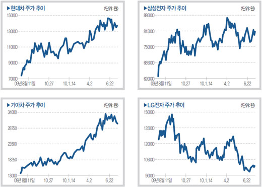 현대자동차그룹의 계열회사인 현대모비스의 경우 투자비중 확대 의견만 9명이었다. 현대차, 기아차의 글로벌 생산량 증가에 따른 실적개선이 기대되는 데다 연 660억원 규모의 현대기아차에 대한 로열티 지급 종료도 이익개선에 기여할 전망이다. 그동안 주가를 낮추는 요인으로 지목돼온 저성장이 해소되면서 시장평균 수준인 주가 추가 상승을 기대해볼 수 있다.