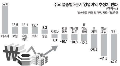 반대로 오히려 기대치가 높아진 업종에는 에너지, 유틸리티, 화학, 증권, 보험이 있다. 전년 동기와 전 분기 대비 모두 실적이 20% 이상 개선될 것으로 점쳐지는 기업이 바로 SK이노베이션, GS, S-Oil 등을 필두로 한 에너지 업종과 LG화학, 롯데케미칼, 대한유화 등 화학 업종이다. 증권 업종도 위탁매매(Brokerage) 부문 등에서 호실적이 기대되는 가운데 15일 처음 발표된 KDB대우증권 2분기 영업이익이 1536억원으로 전년 동기보다 139%, 전 분기보다 7.8% 증가하며 기대에 부응했다.