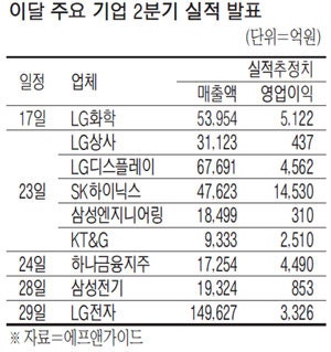 15일 포스코를 시작으로 국내 상장사들의 2분기 실적 발표 '어닝 시즌'이 본격적으로 막을 열었다. LG화학(17일) OCI(22일) LG상사 LG디스플레이 SK하이닉스 삼성엔지니어링 KT&G(이상 23일) 하나금융지주(24일) LG전자(29일) 삼성화재(31일) 등 주요 기업 성적표가 줄줄이 공개될 예정이다.
