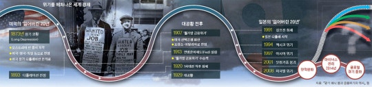 역사적으로 보면 8년은 짧은 기간이 아니다. 금융위기 전문가인 고(故) 찰스 킨들버거 전 MIT대 교수의 집계에 따르면 세계 경제는 1640년 튤립버블 붕괴 이후 376년 사이에 주요 침체(위기)가 40차례 정도 발생했다. 평균 9년에 한 번은 세계 경제가 홍역을 앓았던 셈이다. 그사이 일본뿐 아니라 미국도 ‘잃어버린 20년’을 경험했다. 미국은 1873~1893년에 만성 디플레이션이 낳은 ‘장기 공황(Long Depression)’에 허덕였다. 거품이 갑작스럽게 파열한 뒤 돈의 공급이 줄고 과잉·중복 투자가 해결되지 않아서다.