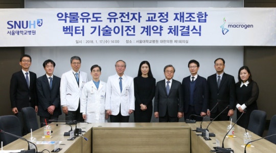 서정선 마크로젠 회장(오른쪽 넷째)과 서창석 원장(왼쪽 여섯째) 등 관계자들이 약물유도 유전자 교정 재조합 벡터 기술이전 계약을 체결한 후 기념촬영을 하고 있다. [사진제공 = 마크로젠]